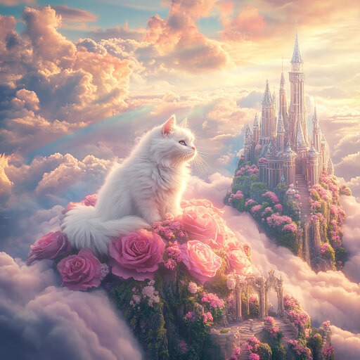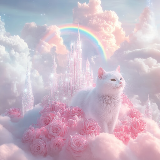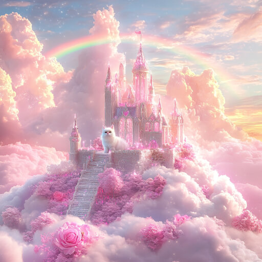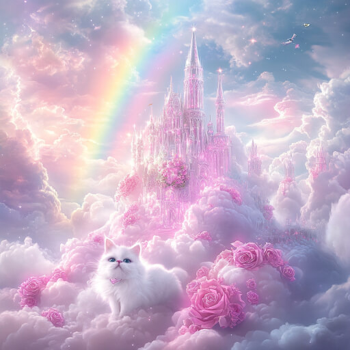 Sky Rainbow Glow, Cat, Pink Rose Clouds, Silver Crystal Castle, Garden on Cloud, Ambient Light, Overall Pink and White, Sunshine, Sparkle, Spectacular, Fairy Tale, Dreamy, No Blue,8k