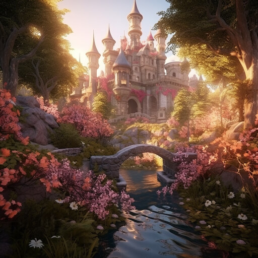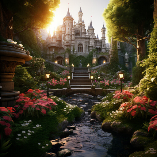 hyperdetailed garden with castle and flowers emerging from ground of hyperdetailed fantasy forest that with a stream flowing through it that glows like the sunset, cinematic lighting, 8k, unreal engine, octane render, realistic