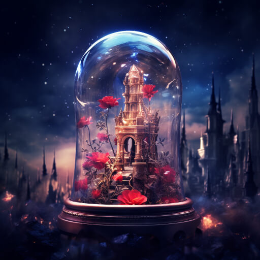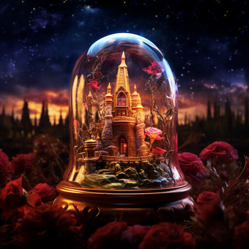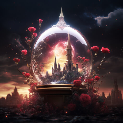 특수한 형태의 투명 유리병 안에 펼쳐진 파노라마 하늘 정원과 장미의 세계, 성, 장미, 흩날리는 꽃잎, 로맨틱하고 꿈 같은 분위기, Greg Lat Kosky 스타일, 밤, 붉은 장미 정자, ArtStation 트렌드, 밝은 조명, 연기, 나무 지지대, 4K, Unreal Engine 4, HD, 조명 효과, 겨울