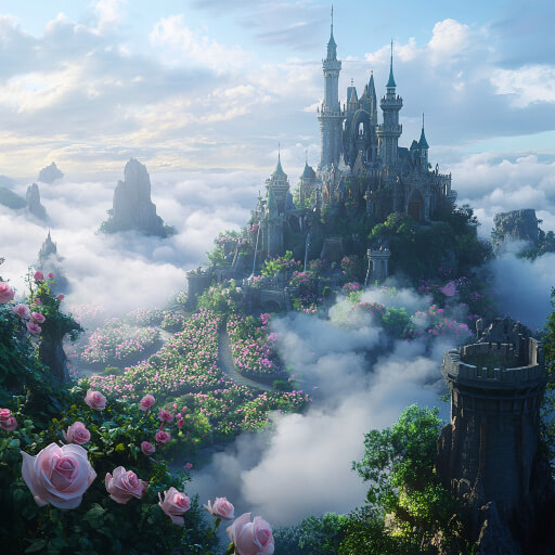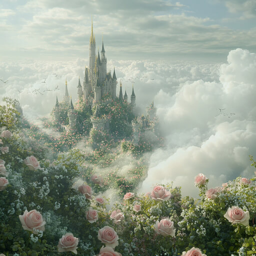 하늘 위, 무지개빛이 가득한 구름 사이로 반짝이는 크리스털 성이 떠오릅니다. 은은한 햇살이 퍼지는 몽환적인 배경 속, 분홍빛 장미 구름과 은빛 정원이 조화를 이루며 동화 속 장면처럼 펼쳐집니다. 한편, 연두빛 구름 위에는 웅장한 디즈니 성이 자리하고 있고, 구름에서 폭포가 흘러내리며 장미의 바다가 끝없이 이어집니다.