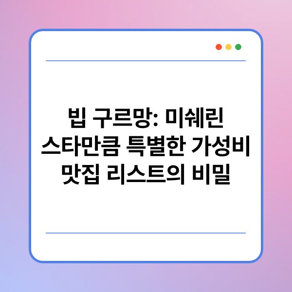 최근 미쉐린 가이드에서 선정된 '빕 구르망'이 많은 주목을 받고 있습니다. 이는 미쉐린 스타를 획득한 레스토랑에 비해 가성비가 뛰어난 식당을 의미합니다. 특히, 품질 높은 음식과 합리적인 가격을 동시에 제공하는 곳으로, 미식가들 사이에서 인기를 끌고 있습니다. 본문에서는 빕 구르망에 대한 정의와 추천 맛집 리스트, 그리고 이 리스트의 비밀을 살펴보겠습니다. 가성비 맛집을 찾는 이들에게 유용한 정보를 제공할 예정입니다.