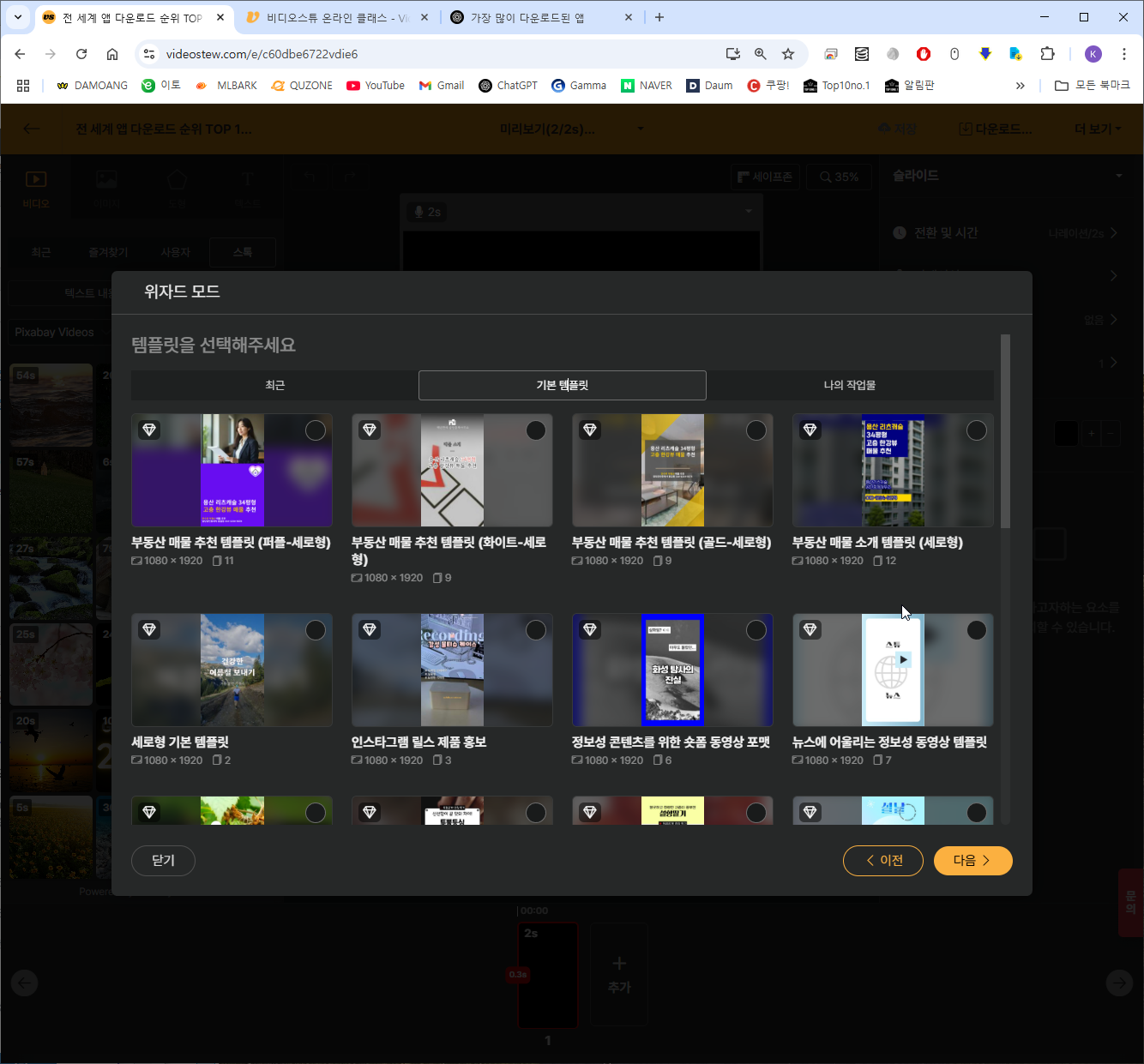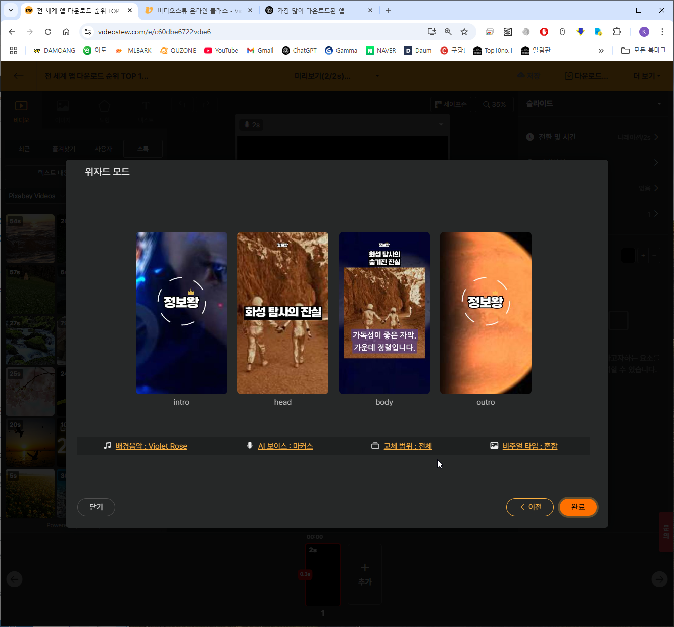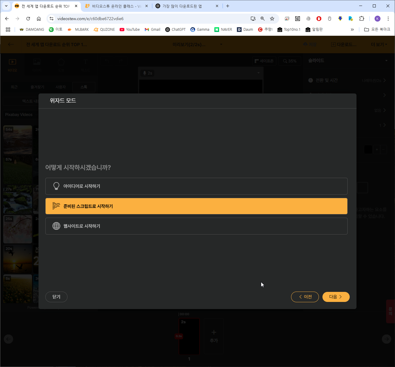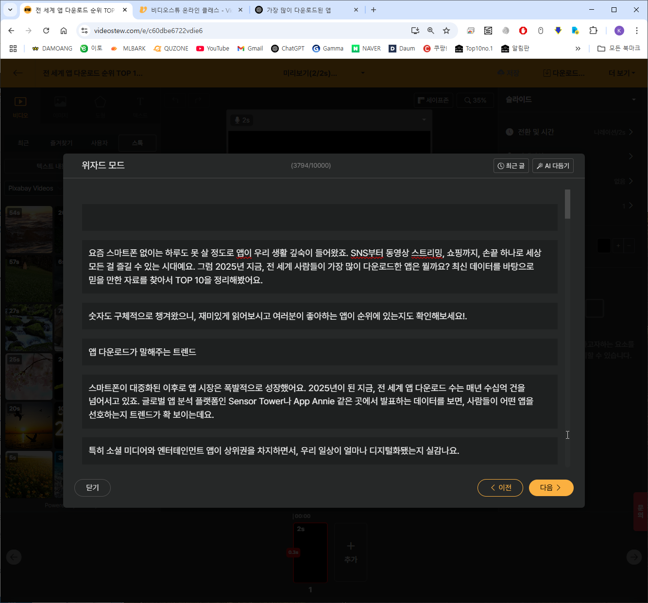 모든 설정이 완료되면 '다음'을 눌러주세요. 그러면 입력된 텍스트에 맞춰 자동으로 가장 잘 매칭되는 영상이 장면마다 삽입됩니다. 거의 수정할 필요 없을 정도로 잘 만들어지는 경우도 있고, 약간의 수정이 필요한 경우도 있을 수 있어요.