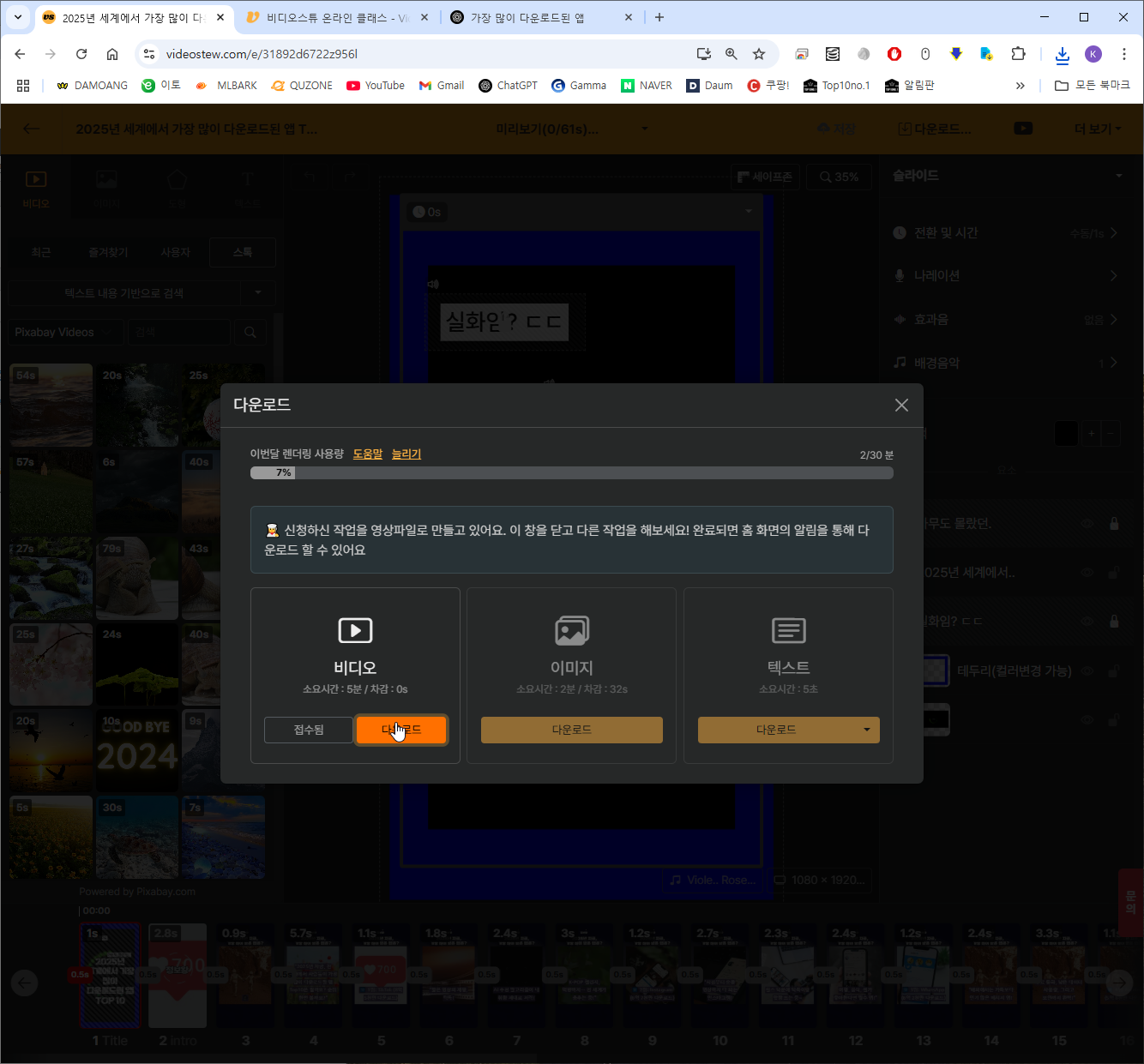 영상이 완성되었다면 상단의 '다운로드' 버튼을 클릭하여 렌더링 신청을 하고, 렌더링이 끝나면 '다운로드' 버튼을 눌러 영상을 저장합니다.