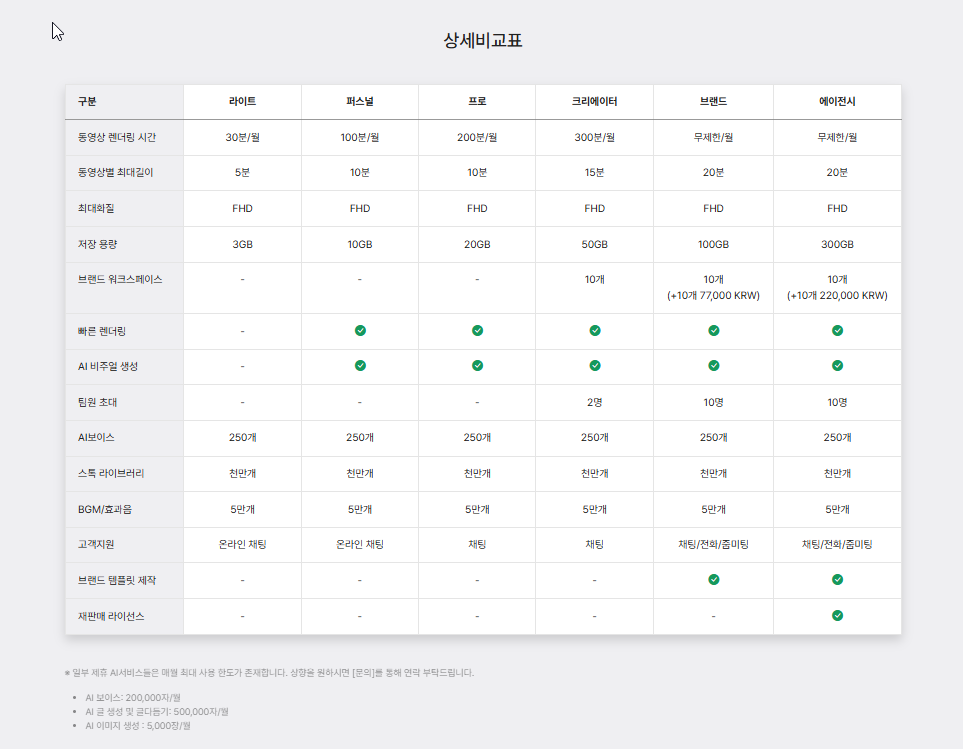 퍼스널(개인용): 월 29,700원, 렌더링 시간 60분 제공. 1분짜리 숏폼을 한 달에 약 60개 제작 가능. 10GB 저장 공간은 숏폼 영상(10MB 이하)에 넉넉합니다.
