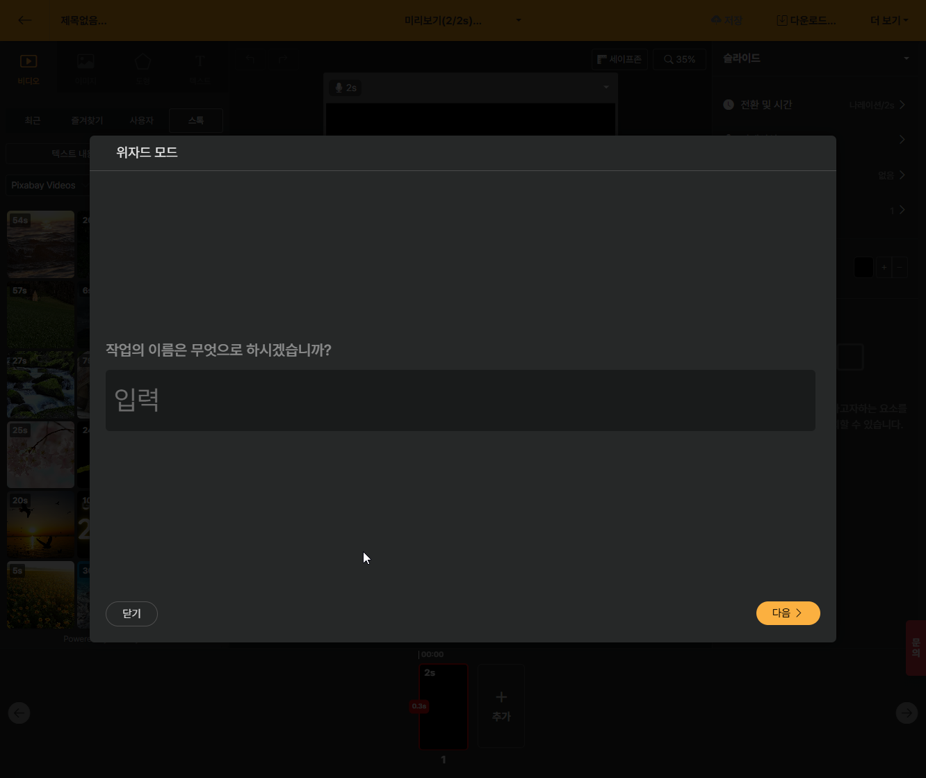 처음에는 위자드 모드를 사용하는 것을 추천합니다. 좀 더 세밀한 편집을 원한다면 직접 제작 모드를 사용해도 되지만, 빠르게 영상을 만들 때는 위자드 모드가 훨씬 편리해요.